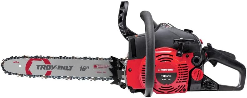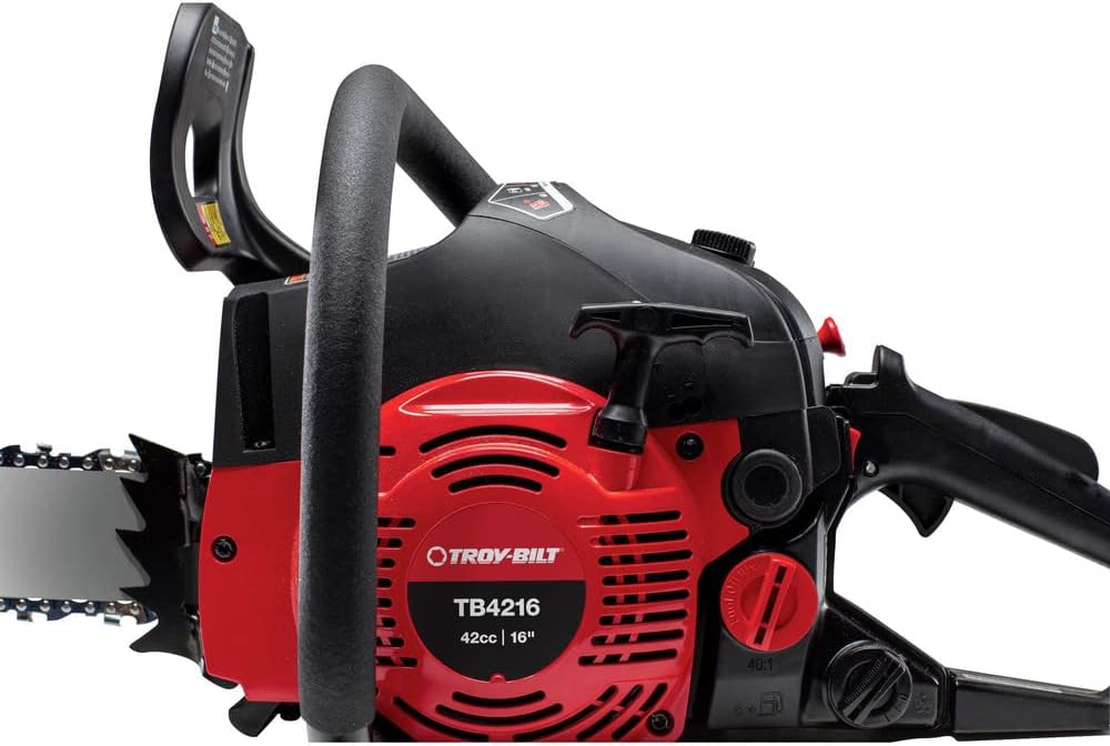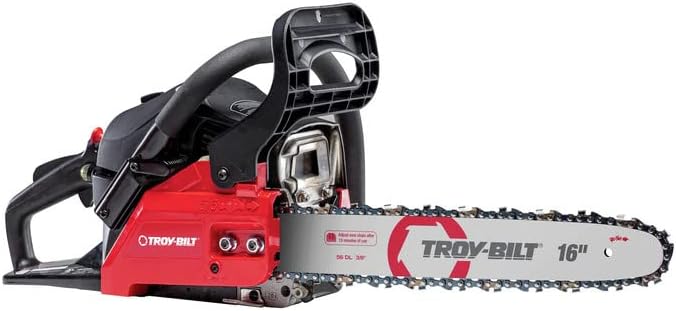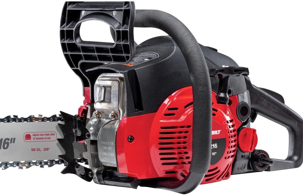 - 16″ low-kickback bar and chain cuts through limbs fast