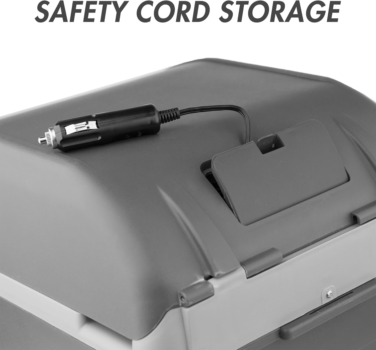 - Easy to use – simply plug into your vehicle’s 12v DC outlet and slide the temperature control switch; 6 foot DC power cord extends to your vehicle’s back seat area; built-in shoulder strap allows for easy transport to take it anywhere you go